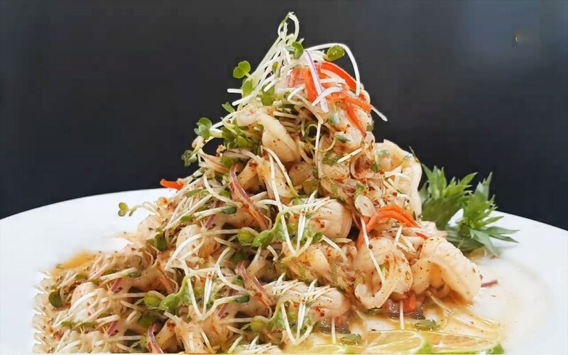• Tiếp theo, chuẩn bị các loại rau mầm, hành tây, cà rốt bào sợi để tạo độ giòn và cân bằng hương vị. Phần nước trộn gỏi thường gồm nước mắm, đường, chanh, tỏi và ớt, được pha theo tỷ lệ hài hòa giữa chua – ngọt – mặn.